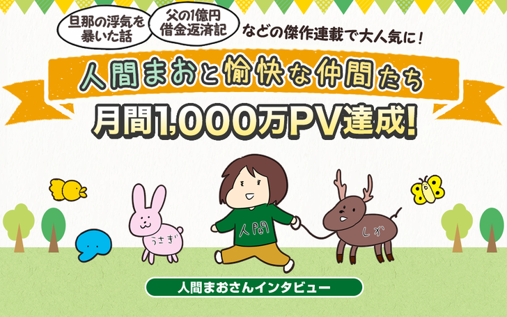 「旦那の浮気を暴いた話」「父の1億円借金返済記」などの傑作連載で大人気に! 『人間まおと愉快な仲間たち』人間まおさん月間1,000万PV達成インタビュー 2021年08月18日 こんにちは、ライブドアブログ編集部です。イッキ読みしてしまう面白さの傑作連載や独特のゆるい笑いがクセになる日常エッセイ漫画などで、幅広い層から人気を集めているブログ『人間まおと愉快な仲間たち』がこのたび月間1,000万PVを達成しました! 複数の連載を抱える漫画 ... もっと見る